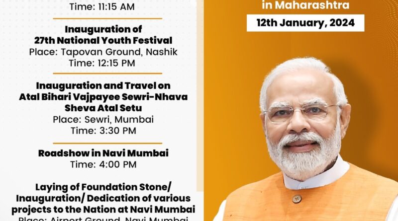 पीआईबी की विज्ञप्ति के अनुसार, प्रधानमंत्री नरेन्द्र मोदी दोपहर करीब 12:15 बजे नासिक पहुंचेंगे। यहां वो 27वें राष्ट्रीय युवा महोत्सव का उद्घाटन करेंगे। अपराहान करीब 3:30 बजे मुंबई में अटल बिहारी वाजपेयी सेवारी-न्हावा शेवा अटल सेतु का उद्घाटन करेंगे। लगभग 4:15 बजे प्रधानमंत्री नवी मुंबई में एक सार्वजनिक कार्यक्रम में शामिल होंगे। यहां वो कई विकास परियोजनाओं का उद्घाटन कर उन्हें राष्ट्र को समर्पित करेंगे। साथ ही कई परियोजनाओं की आधारशिला रखेंगे। कार्यक्रम के दौरान प्रधानमंत्री करीब 2000 करोड़ रुपये की रेलवे परियोजनाएं राष्ट्र को समर्पित करेंगे। प्रधानमंत्री उरण रेलवे स्टेशन से खारकोपर तक चलने वाली ईएमयू ट्रेन के उद्घाटन कार्यक्रम को भी हरी झंडी दिखाएंगे।