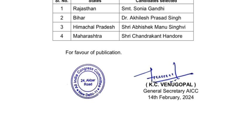 कांग्रेस महासचिव केसी वेणुगोपाल ने बुधवार को एक विज्ञप्ति जारी कर कहा कि कांग्रेस अध्यक्ष मल्लिकार्जुन खड़गे ने राज्यसभा के लिए चार नामों को स्वीकृति दी है। इसके तहत सोनिया गांधी राजस्थान से, वरिष्ठ अधिवक्ता अभिषेक मनु सिंहवी हिमाचल प्रदेश, डॉ. अखिलेश प्रसाद सिंह बिहार और चन्द्रकांत खंडूरे महाराष्ट्र से राज्यसभा के उम्मीदवार होंगे।