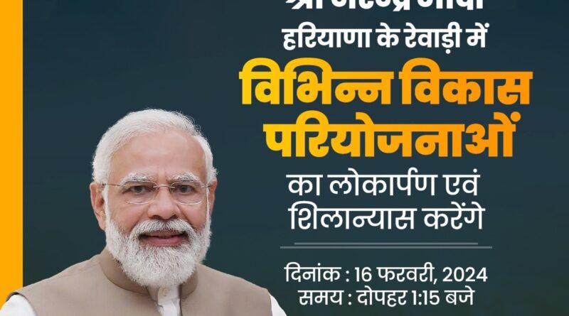 नई दिल्ली, 16 फरवरी । प्रधानमंत्री नरेन्द्र मोदी आज (शुक्रवार) हरियाणा के रेवाड़ी में दोपहर लगभग 1ः15 बजे प्रधानमंत्री शहरी परिवहन, स्वास्थ्य, रेल और पर्यटन क्षेत्र से संबंधित 9750 करोड़ रुपये से अधिक की विकास परियोजनाओं की सौगात देंगे। वो करीब 5450 करोड़ रुपये की लागत से विकसित होने वाली गुरुग्राम मेट्रो रेल परियोजना और अखिल भारतीय आयुर्विज्ञान संस्थान (एम्स) रेवाड़ी की आधारशिला रखेंगे। प्रधानमंत्री के रेवाड़ी कार्यक्रम का सचित्र विवरण भारतीय जनता पार्टी (भाजपा) ने अपने एक्स हैंडल पर साझा किया है। केंद्र सरकार के पत्र सूचना कार्यालय (पीआईबी) ने भी प्रधानमंत्री मोदी के रेवाड़ी दौरे के कार्यक्रम की विस्तृत जानकारी विज्ञप्ति में दी है।