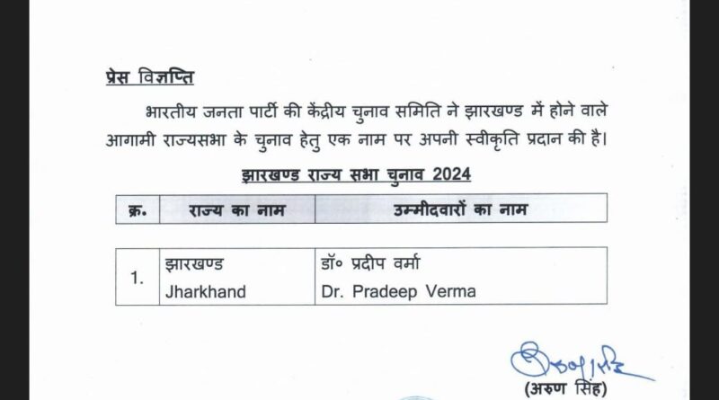 शनिवार को भाजपा के राष्ट्रीय महासचिव व मुख्यालय प्रभारी अरुण सिंह की ओर से जारी सूचना में कहा गया है कि केन्द्रीय चुनाव समिति ने झारखंड में होने वाले आगामी राज्यसभा चुनाव के लिए एक डॉ. प्रदीप वर्मा के नाम पर स्वीकृति प्रदान की है।