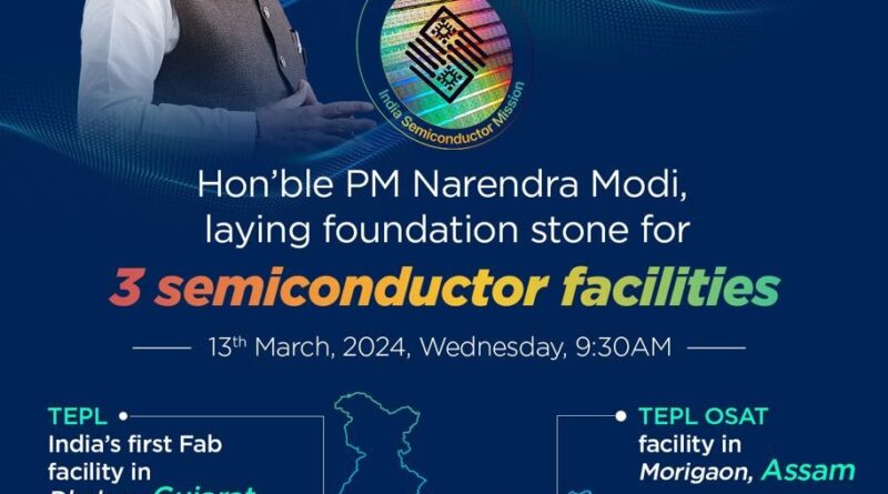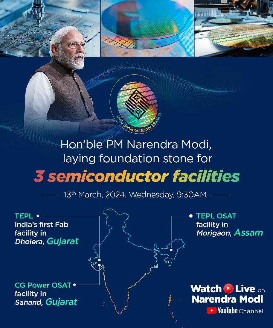 नई दिल्ली, 13 मार्च । प्रधानमंत्री नरेन्द्र मोदी आज (बुधवार) सुबह लगभग 9ः30 बजे वीडियो कॉन्फ्रेसिंग के माध्यम से ‘इंडियाज टेकेड: चिप्स फॉर विकसित भारत’ कार्यक्रम में शामिल होंगे। वो गुजरात के धोलेरा विशेष निवेश क्षेत्र और साणंद के अलावा असम के मोरीगांव में करीब 1.25 लाख करोड़ रुपये की तीन सेमीकंडक्टर परियोजनाओं की आधारशिला रखेंगे। इन परियोजनाओं से सेमीकंडक्टर ईको-सिस्टम सुदृढ़ होगा और युवाओं के लिए रोजगार के अवसर पैदा होंगे।