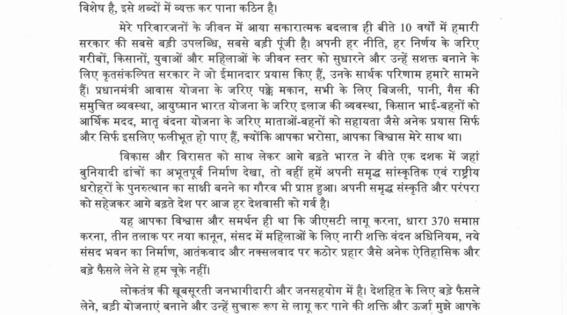 प्रधानमंत्री मोदी ने अपनी चिट्ठी में आभार जताते हुए स्वीकार किया है, ”यह आपका विश्वास और समर्थन ही था कि जीएसटी लागू करना, अनुच्छेद 370 समाप्त करना, तीन तलाक पर नया कानून, संसद में महिलाओं के लिए नारी शक्ति वंदन अधिनियम, नये संसद भवन का निर्माण, आतंकवाद और नक्सलवाद पर कठोर प्रहार जैसे अनेक ऐतिहासिक और बड़े फैसले लेने से हम चूके नहीं।”