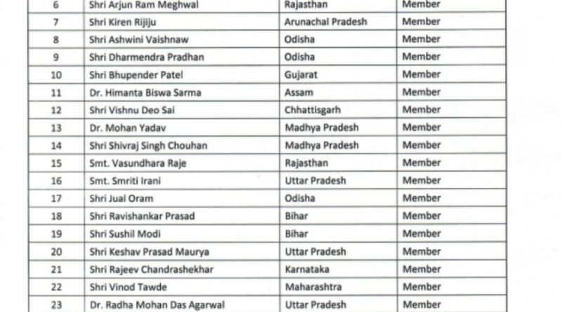 कमेटी में अर्जुन मुंडा, भूपेन्द्र यादव, अर्जुन राम मेघवाल, किरेन रिजिजू, अश्विनी वैष्णव, धर्मेन्द्र प्रधान, स्मृति ईरानी, सुशील मोदी, विनोद तावड़े और अनिल एंटोनी शामिल हैं।