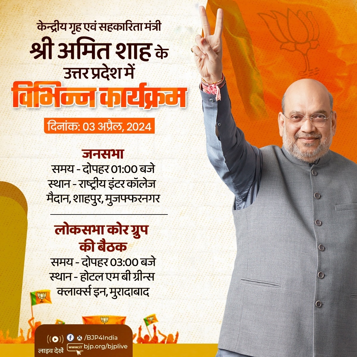 भाजपा के एक्स हैंडल के अनुसार, शाह दोपहर एक बजे मुजफ्फरनगर के शाहपुर में राष्ट्रीय इंटर कालेज के मैदान में पार्टी की जनसभा को संबोधित करेंगे। इसके बाद वह मुरादाबाद पहुंचेंगे। वहां शाह अपराह्न तीन बजे होटल एबी ग्रीन्स क्लार्क्स इन में लोकसभा कोर ग्रुप की बैठक में हिस्सा लेंगे।