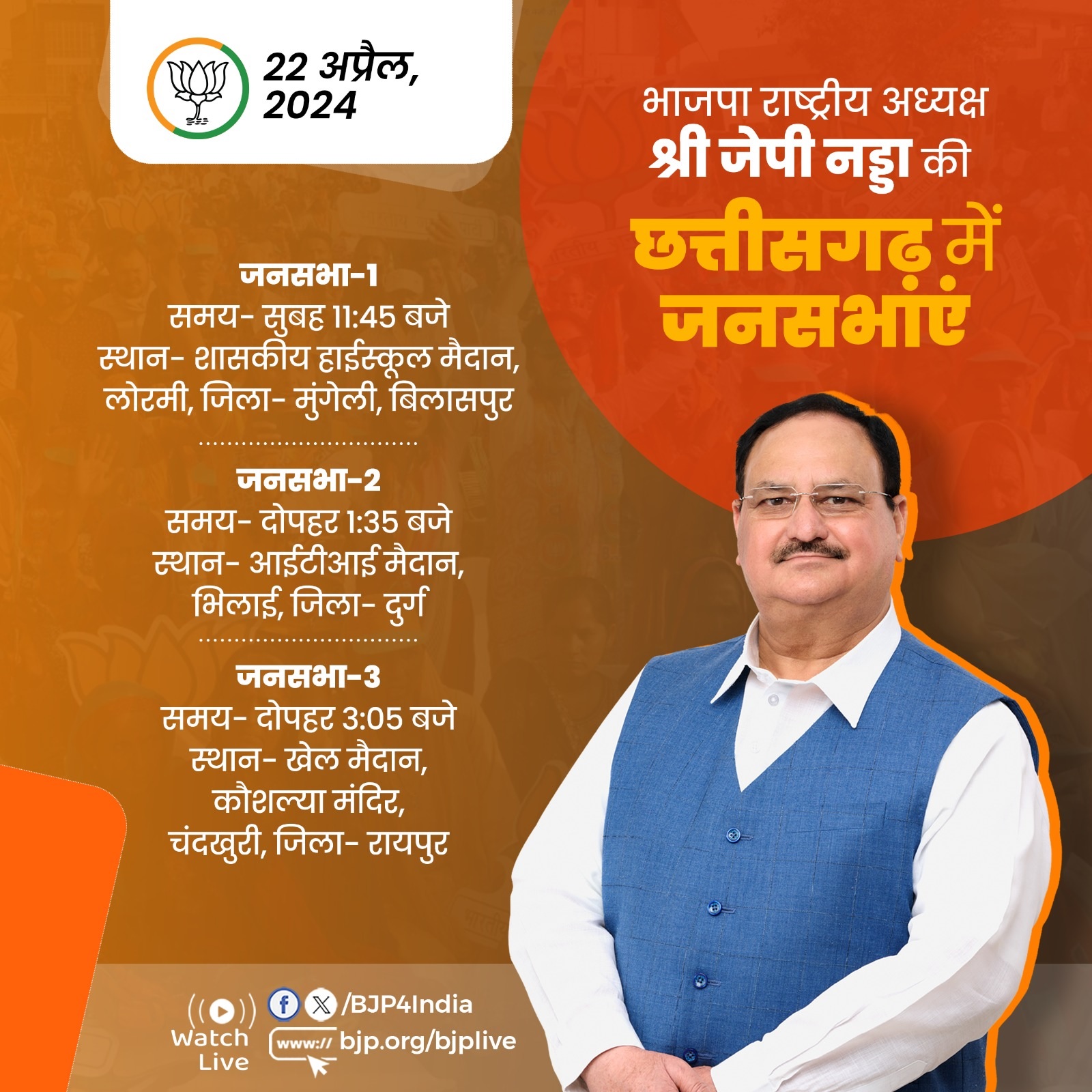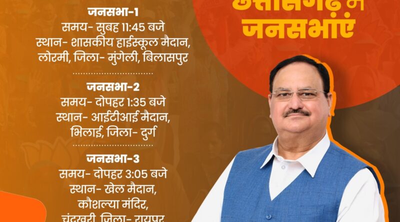 भाजपा के एक्स हैंडल के अनुसार, केंद्रीयमंत्री अमित शाह सुबह साढ़े 10 बजे राज्य के कांकेर की जनसभा में मतदाताओं से भाजपा उम्मीदवारों के जिताने की अपील करेंगे। जेपी नड्डा आज दिन में सबसे पहले पौन बारह बजे धान के कटोरा के रूप प्रसिद्ध बिलासपुर जिले मुंगेली के लोरमी में जनसभा को संबोधित करेंगे। यह जनसभा शासकीय हाईस्कूल मैदान लोरमी में होनी है। इसके बाद वो राजधानी रायपुर से सटे दुर्ग जिले के इस्पात शहर भिलाई पहुंचेंगे। नड्डा भिलाई के आईटीआई मैदान में दोपहर 1ः35 बजे जनसभा को संबोधित करेंगे। आखिर में वो तीन बजकर पांच मिनट पर प्रदेश की राजधानी रायपुर में जनसभा को संबोधित करेंगे। यह जनसभा चंद्रखुरी के कौशल्या मैदान में होनी है।