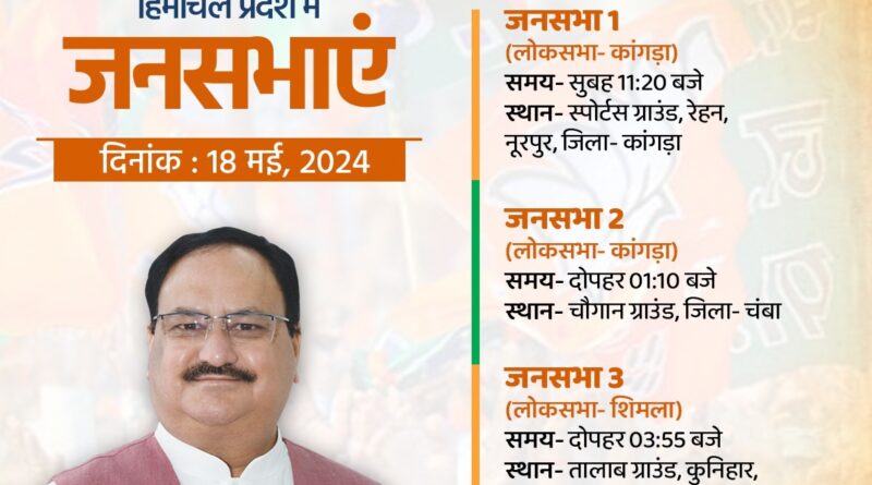 भाजपा के एक्स हैंडल के अनुसार नड्डा आज सबसे पहले कांगड़ा लोकसभा क्षेत्र में चुनाव प्रचार करेंगे। वह पूर्वाह्न 11ः20 बजे नूरपुर रेहन के स्पोर्ट्स ग्राउंड में जनसभा को संबोधित करेंगे। इसके बाद वह इसी लोकसभा क्षेत्र के चंबा जिले में प्रचार करेंगे। नड्डा दोपहर 1ः10 बजे चौगान ग्राउंड में जनसभा को संबोधित करने के बाद शिमला लोकसभा क्षेत्र पहुंचेंगे। वह सोलन के कुनिहार स्थित तालाब ग्राउंड में शाम ढलने से कुछ पहले 3ः55 बजे जनसभा को संबोधित करेंगे।