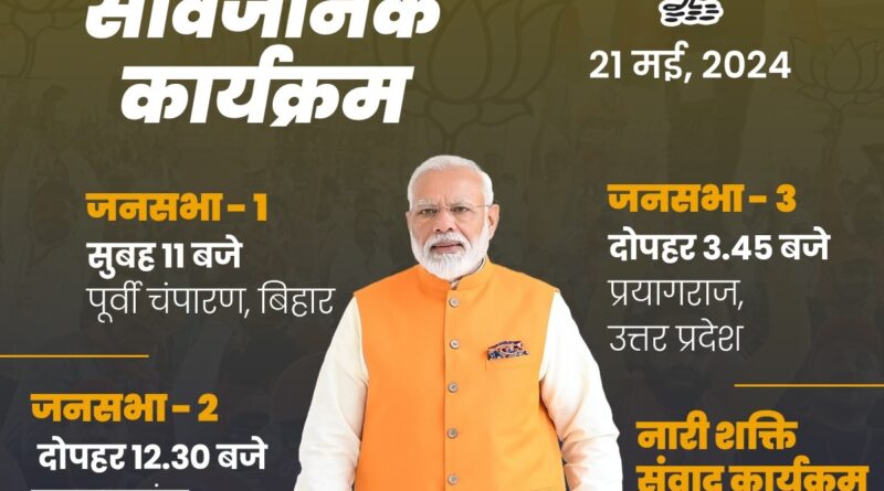 नई दिल्ली, 21 मई । भारतीय जनता पार्टी (भाजपा) के शीर्ष नेता और सबसे बड़े स्टार प्रचारक प्रधानमंत्री नरेन्द्र मोदी आज बिहार और उत्तर प्रदेश में चुनाव प्रचार करेंगे। वो आज सुबह बिहार के पूर्वी चंपारण में जनसभा को संबोधित करने के साथ आज के प्रचार का श्रीगणेश करेंगे। भाजपा ने प्रधानमंत्री नरेन्द्र मोदी के आज के चुनावी कार्यक्रम को एक्स हैंडल पर साझा किया है।