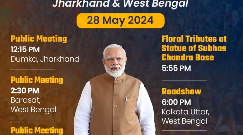 प्रधानमंत्री मोदी झारखंड के दुमका से सीधे पश्चिम बंगाल जाएंगे। वो दोपहर ढाई बजे बारासात में जनसभा को संबोधित करने के बाद जादवपुर पहुंचेंगे। यहां उनकी जनसभा शाम चार बजे होनी है। यहां से प्रधानमंत्री मोदी पश्चिम बंगाल की राजधानी कोलकाता पहुंचेंगे। वो कोलकाता उत्तर में शाम छह बजे रोड शो करेंगे। रोड शो शाम सात बजे स्वामी विवेकानंद के आवास के पास संपन्न होगा।