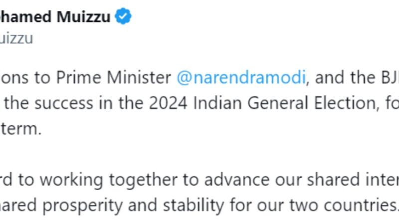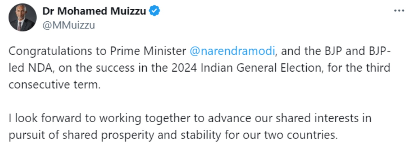मालदीव के राष्ट्रपति डॉ. मोहम्मद मुइजू ने लिखा है, “प्रधानमंत्री नरेन्द्र मोदी और भाजपा तथा भाजपा के नेतृत्व वाले एनडीए को 2024 के भारतीय आम चुनाव में लगातार तीसरी बार सफलता मिलने पर बधाई। मैं दोनों देशों की साझा समृद्धि और स्थिरता की दिशा में अपने साझा हितों को आगे बढ़ाने के लिए मिलकर काम करने की आशा करता हूं।”
