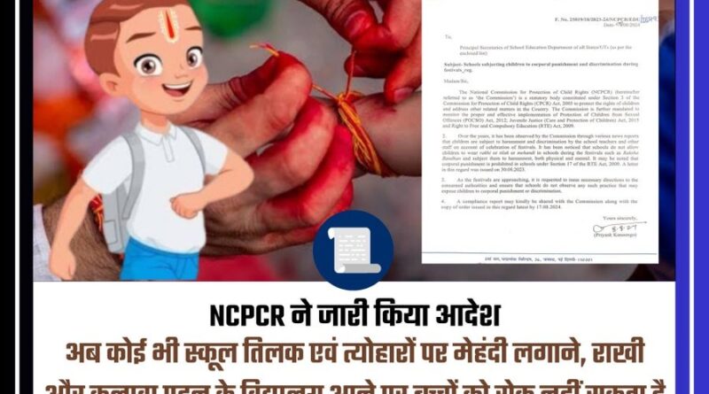 राष्ट्रीय बाल संरक्षण आयोग के अध्यक्ष की ओर से जारी निर्देश में साफ लिखा है कि, ‘‘रक्षाबंधन का पर्व आ रहा है, बच्चे राखी बांधकर तिलक, मेहंदी लगाकर स्कूल आएँगे, ऐसे में स्कूलों को उनके धार्मिक विश्वास का सम्मान बनाए रखना चाहिए। यदि किसी स्कूल ने पर्व के दौरान बच्चों को इन विषयों पर दंडित किया तो स्कूल के विरुद्ध क़ानूनी कार्रवाई की जाएगी। तत्संबंध में राज्य सरकारों को आवश्यक निर्देश जारी किए जा चुके हैं।’’