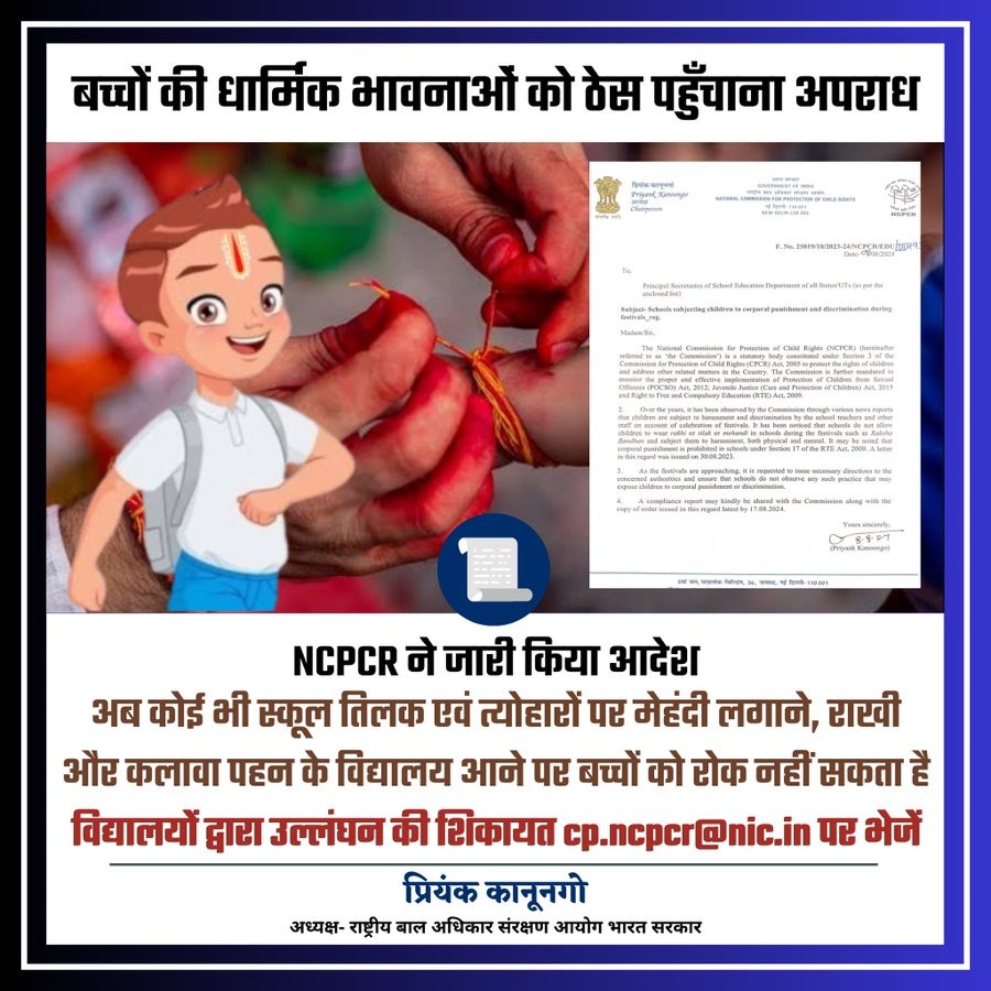 भोपाल, 12 अगस्त | स्कूलों, विशेषकर मिशनरी स्कूलों में हिन्दू धर्म और समाज के प्रतीकों के प्रति नकारात्मक व दुर्भावनापूर्ण रवैया अपनाने के खिलाफ राष्ट्रीय बाल संरक्षण आयोग (एनसीपीसीआर) ने इस बार पहले से ही चेतावनी जारी कर दी है। एनसीपीसीआर के अध्यक्ष प्रियंक कानूनगो ने रक्षाबंधन, जन्माष्टमी व आगामी अन्य त्योहारों के मद्देनजर स्पष्ट दिशा-निर्देश जारी किए हैं। इस निर्देश में साफ तौर पर कहा गया है कि ‘‘बच्चों की धार्मिक भावनाओं को ठेस पहुंचाना अपराध है। अब कोई भी स्कूल तिलक एवं त्योहारों पर मेंहदी लगाने, राखी और कलावा पहन कर विद्यालय आने पर बच्चों को रोक नहीं सकता है, विद्यालय द्वारा उल्लंघन की शिकायत बाल आयोग को भेजें।’’