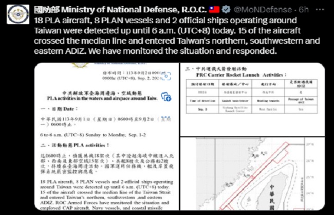 ताइवान के रक्षा मंत्रालय ने एक्स पोस्ट में साफ किया है कि चाइनीज सेना के 18 लड़ाकू विमान, आठ युद्धक जहाज और दो अन्य जहाज ताइवान की सीमा के पास रविवार सुबह छह बजे से सोमवार सुबह छह बजे तक डटे रहे। इनमें से 15 विमानों ने तो ताइवान की सीमा को भी पार कर देश की वायु सीमा का उल्लंघन किया।