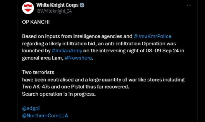 सेना की जम्मू स्थित व्हाइट नाइट कोर ने एक्स पर कहा कि संभावित घुसपैठ की कोशिश के बारे में खुफिया एजेंसियों और पुलिस के इनपुट के आधार पर आठ और नौ सितंबर की दरमियानी रात लाम सेक्टर में घुसपैठ विरोधी अभियान शुरू किया गया। इस दौरान दो आतंकियों को मार गिराया गया। उनके पास से अब तक दो एके-47 और एक पिस्तौल सहित अन्य हथियार बरामद हुए हैं। सैन्य अधिकारियों का कहना है कि मुठभेड़ के बाद इलाके में रोशनी कर सारी रात निगरानी रखी गई। सवेरा होते ही दोबारा अभियान शुरू कर दिया गया।