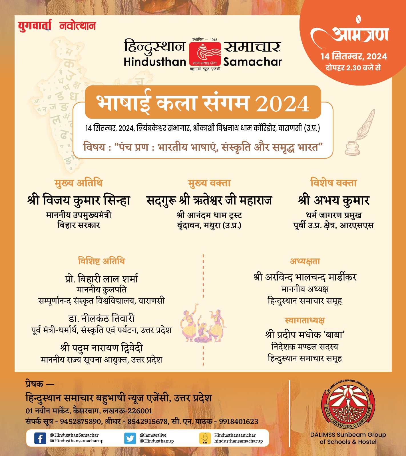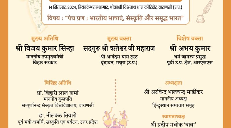 अपरान्ह ढाईई बजे से शुरू होने वाले इस कार्यक्रम में श्री आनंदम धाम ट्रस्ट वृंदावन मथुरा के संत सद्गुरु ऋतेश्वर जी महाराज की खास मौजूदगी रहेगी। अन्य विशिष्ट वक्ताओं में आरएसएस के पूर्वी उत्तर प्रदेश क्षेत्र धर्म जागरण प्रमुख अभय कुमार, सम्पूर्णानंद संस्कृत विश्वविद्यालय वाराणसी के कुलपति प्रो. बिहारी लाल शर्मा, उत्तर प्रदेश के पूर्व मंत्री और वाराणसी शहर दक्षिणी के विधायक डॉ नीलकंठ तिवारी, राज्य सूचना आयुक्त पदुम नारायण द्विवेदी शामिल हैं। लब्ध प्रतिष्ठित पत्रकार एवं साहित्यकार भारतेन्दु हरिश्चंद्र के ध्येय वाक्य ,’निज भाषा उन्नति अहै,सब उन्नति को मूल ‘ को समर्पित इस कार्यक्रम में ‘पंच प्रण : भारतीय भाषाएं,संस्कृति और समृद्ध भारत ‘विषयक सेमिनार भी होगा। इस अवसर पर विभिन्न भारतीय भाषाई क्षेत्र के लोककला,शास्त्रीय और जनजातीय क्षेत्र के 21 विशिष्ट जनों का सम्मान होगा। इस दौरान हिन्दुस्थान समाचार समूह की दो पत्रिकाओं युगवार्ता (पाक्षिक) तथा नवोत्थान (मासिक)का ‘भारतीय कला क्षेत्र’ पर केन्द्रित विशेष अंक का लोकार्पण भी होगा।