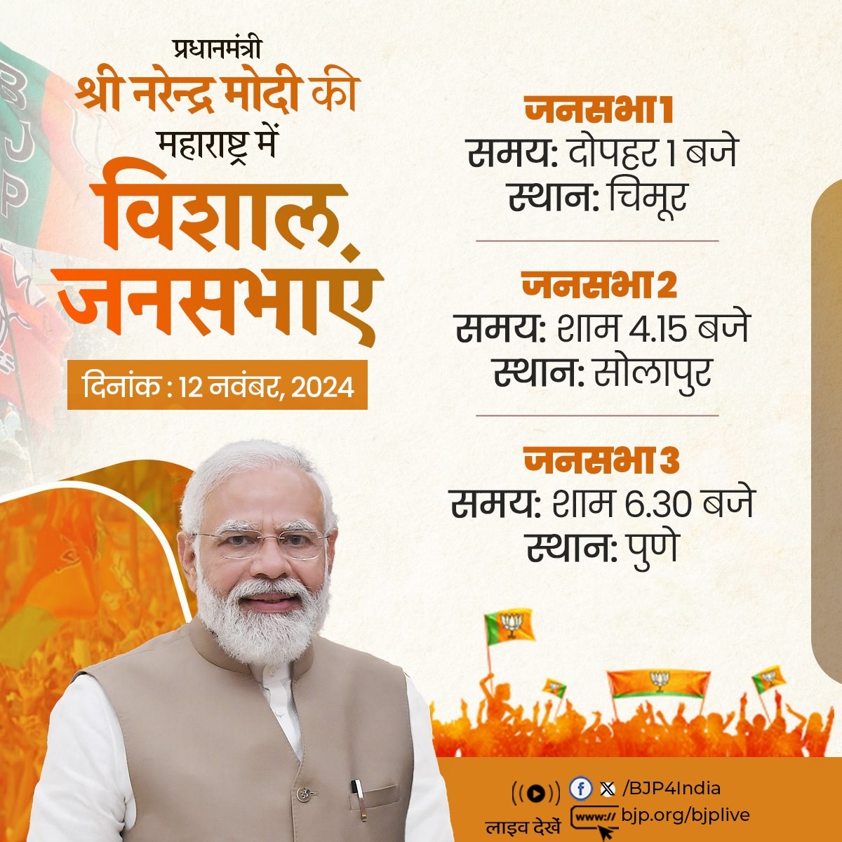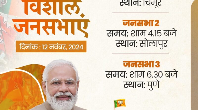 भाजपा के अनुसार, प्रधानमंत्री नरेन्द्र मोदी महाराष्ट्र के चिमूर में दोपहर एक बजे विशाल जनसभा को संबोधित करेंगे। उनकी दूसरी जनसभा सोलापुर में होनी है। प्रधानमंत्री सोलापुर में शाम सवा चार बजे मतदाताओं से रूबरू होंगे। यहां से वो पुणे पहुंचेंगे। यहां उनकी जनसभा शाम साढ़े छह बजे होगी। केंद्रीयमंत्री शाह सबसे पहले झारखंड पहुंचेंगे।