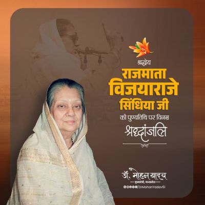 मुख्यमंत्री डाॅ यादव ने साेशल मीडिया एक्स पर पाेस्ट करते हुए लिखा राष्ट्रसेवा के परम पावन ध्येय के साथ जनसंघ एवं भाजपा को गढ़ने में अतुलनीय योगदान देने वाली, परम श्रद्धेय राजमाता विजयाराजे सिंधिया जी की पुण्यतिथि पर सादर श्रद्धांजलि अर्पित करता हूं। ममता, त्याग एवं समर्पण की त्रिवेणी से परिष्कृत आपका अद्भुत व्यक्तित्व सदैव राष्ट्र सेवा और लोककल्याण की प्रेरणा देता रहेगा।