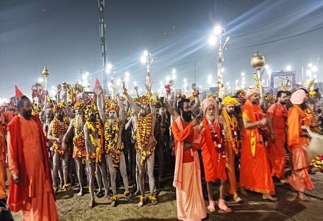 अखाड़े के साधु-संतों और विशेषकर नागा साधुओं का देखने के लिये श्रद्धालु कतारबद्ध खड़े हुए हैं। साधु संतों को देखकर श्रद्धालु उत्साह और उमंग में ‘हर हर महादेव’ का नारा लगाते हैं, तो वायुमण्डल में एक लहर सी दौड़ जाती है। बैड़ बाजों की धुन पर थिरकते, भागते और तरह तरह के करतब करते नागा साधु वातावरण में एक अलग तरीके की ऊर्जा का संचार करते हैं, जिससे वातावरण गुलजार हो जाता है। हर हर महादेव, गंगा मैया की जय के जयकारे रह-रह कर आकाश तक को गूंजा देते हैं।