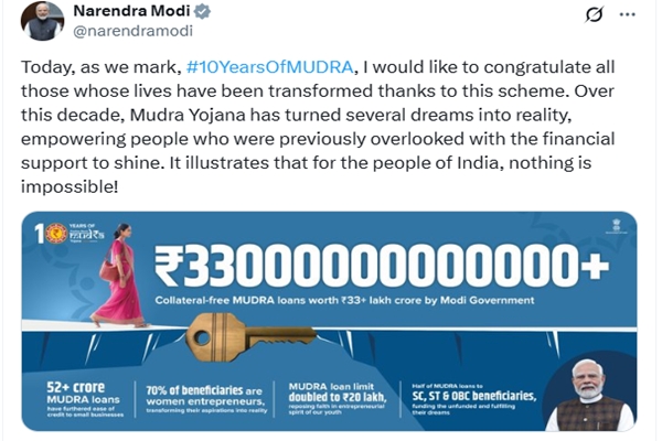 प्रधानमंत्री मोदी ने मुद्रा योजना के लाभार्थियों को बधाई दी, कहा कि इस योजना ने सपनों को हकीकत में बदल दिया