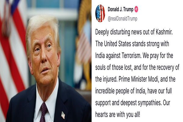 अमेरिकी राष्ट्रपति डोनाल्ड ट्रंप ने कश्मीर में हुए आतंकवादी हमले के मद्देनजर प्रधानमंत्री नरेंद्र मोदी और भारत के लोगों को “पूर्ण समर्थन और गहरी सहानुभूति” व्यक्त की है। राष्ट्रपति ट्रंप ने ट्रुथ सोशल पर लिखा, “कश्मीर से बहुत परेशान करने वाली खबर आई है।” “अमेरिका आतंकवाद के खिलाफ भारत के साथ मजबूती से खड़ा है। हम मारे गए लोगों की आत्मा की शांति और घायलों के स्वस्थ होने की प्रार्थना करते हैं। प्रधानमंत्री मोदी और भारत के अविश्वसनीय लोगों को हमारा पूरा समर्थन और गहरी सहानुभूति है। हमारी संवेदनाएं आप सभी के साथ हैं।”