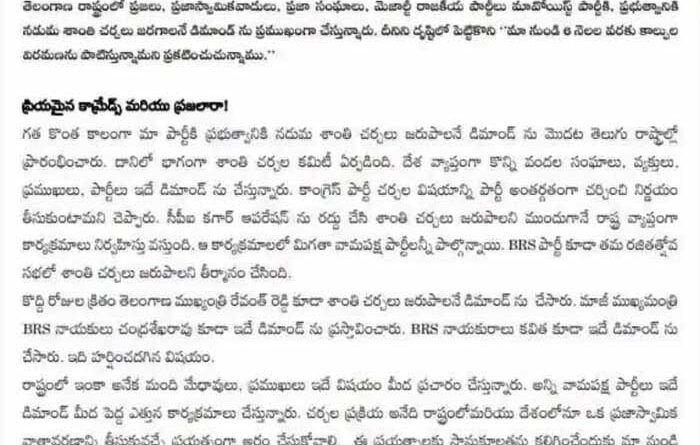नक्सली प्रवक्ता जगन ने पर्चा जारी कर छह महीने तक युद्धविराम की घोषणा कर दी है। नक्सलियाें द्वारा तेलगु भाषा में जारी पर्चे में लिखा है कि तेलंगाना के मुख्यमंत्री रेवंत रेड्डी, पूर्व मुख्यमंत्री चंद्रशेखर राव और कविता ने भी शांति वार्ता के लिए पहल करने और इसके लिए समिति का गठन करने के लिए नक्सलियाें ने इसे गर्व की बात कहा है।