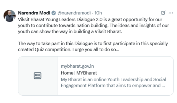 एक सोशल मीडिया पोस्ट में, श्री मोदी ने कहा, “विकसित भारत युवा नेता संवाद 2.0 देश के युवाओं के लिए राष्ट्र निर्माण में योगदान देने का एक बेहतरीन अवसर है। उन्होंने कहा कि युवाओं के विचार और अंतर्दृष्टि विकसित भारत के निर्माण का मार्ग प्रशस्त कर सकते हैं। लोग इस महीने की 31 तारीख तक इस क्विज़ में भाग ले सकते हैं।”