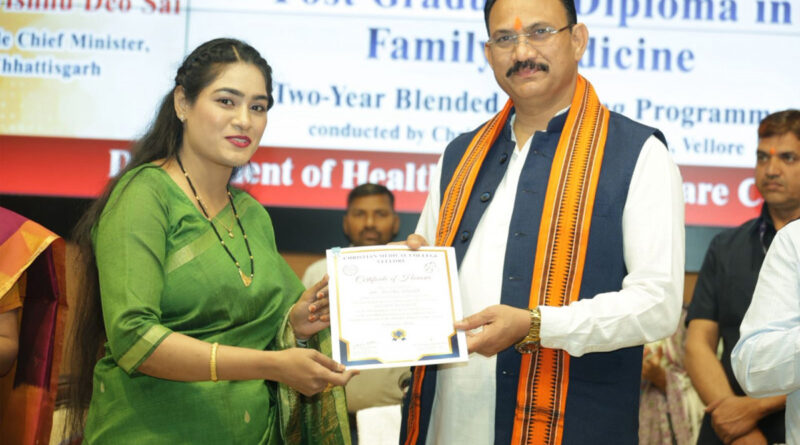 रायपुर 27 फ़रवरी । रायपुर के सिविल लाइन स्थित सर्किट हाउस में क्रिश्चियन मेडिकल कॉलेज, वेल्लोर द्वारा आयोजित पी. जी. डिप्लोमा इन फैमिली मेडिसिन के दीक्षांत समारोह का आयोजन आज शुक्रवार काे संपन्न हुआ। स्वास्थ्य मंत्री श्याम बिहारी जायसवाल ने समारोह में सफलतापूर्वक डिप्लोमा पाठ्यक्रम पूर्ण करने वाले सभी डॉक्टरों को प्रमाणपत्र प्रदान किया।